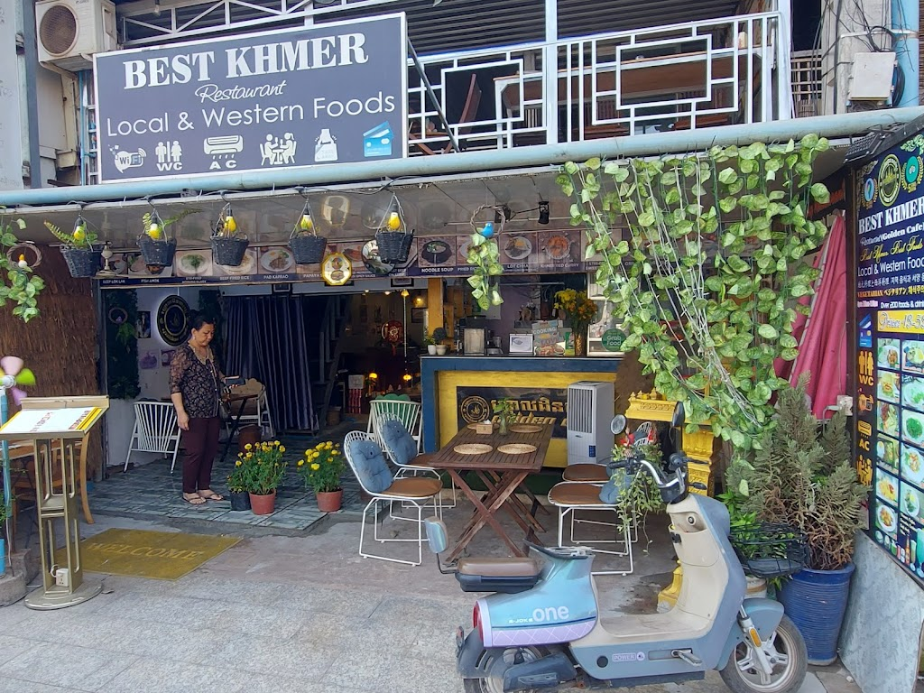 Best Khmer Restaurant (Golden Cafe) ហ្គោលដិនកាហ្វេ is a charming family-operated restaurant in Siem Reap offering generous portions of delicious Khmer cuisine. Known for its attentive service, guests appreciate the welcoming atmosphere, complete with complimentary tea and refreshing towels. The air-conditioned dining area provides relief from the heat, enhancing comfort. Vegetarian options are thoughtfully prepared, making it an inclusive spot for all tastes. This gem combines excellent food with heartfelt hospitality for an unforgettable dining experience.